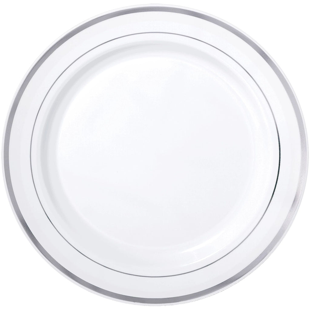 Enhance your dining experience with our Elegant Silver Trim Premium Plastic Dinner Plates. Measuring 10.25 inches, these plates feature a sophisticated metallic silver border that mimics fine china, offering both style and durability for any occasion. Perfect for luncheons, weddings, birthday parties, and more, these heavy-duty plates provide the convenience of plastic with an upscale look. Each pack includes 20 plates, ensuring a cohesive and impressive table setting. Please note, these plates are not microwave or dishwasher safe, but they clean up easily by hand. Ideal for both casual and formal events, entertain effortlessly with these versatile plates.