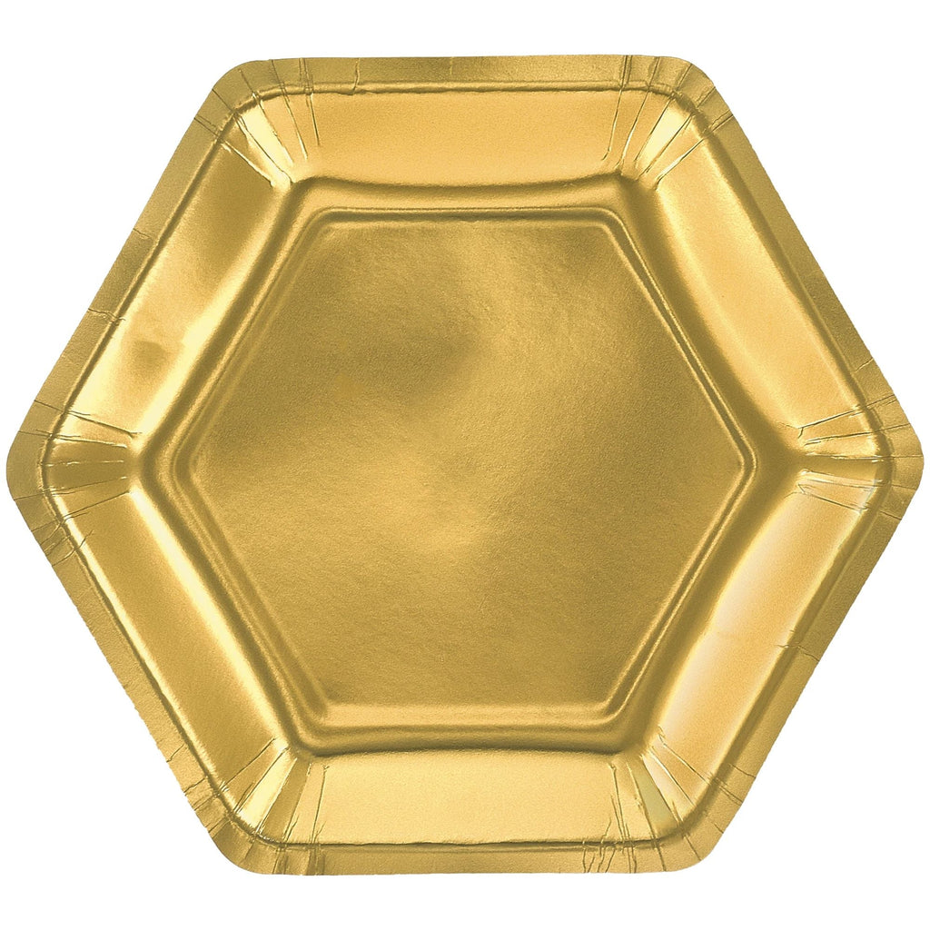 Elevate your event with our Gold Hexagon Metallic 7" Party Plates. Perfect for adding a touch of elegance to any occasion, these dazzling plates are ideal for appetizers and desserts. Their unique hexagonal shape and luxurious gold finish will impress your guests and enhance your table setting. Crafted for both style and convenience, these plates are a must-have for any celebration.