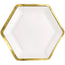 Elevate your dining experience with these elegant 7" White Hexagon Metallic Plates. Perfect for any occasion, these plates feature a chic gold metallic border that adds a touch of sophistication to your table setting. Crafted from high-quality paper, they combine durability with style, making them ideal for everyday use or special events. Impress your guests with these modern and versatile plates, perfect for solid color themes or printed ensembles.